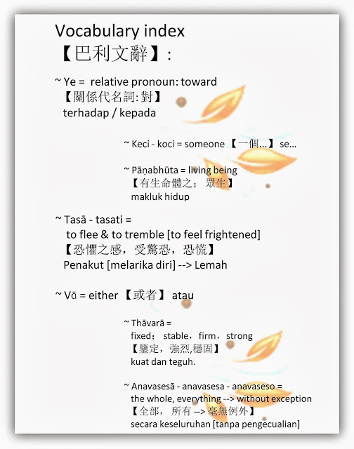 penerjemahan disini dibuat berdasarkan kitab penjelasan mengenai arti atau maksud dari tiap kata yang diungkapkan oleh Guru Agung kita Lord Buddha, sehingga kita bisa lebih terarah dan faham dengan lebih terurai makna yang terkandung dari setiap kata yang disabdakan oleh Beliau tanpa adanya spekulasi atau menebak nebak yang tidak berarah. Terjemahan disini langsung di check dari kosakata bahasa pali yang diterjemahkan kedalam bahasa Inggris, mandarin dan Indonesia. Sehingga pengertian akan lebih terurai, dan demi melengkapi terjemahan terjemahan yang sudah ada di Indonesia yang hanya mengacu kepada terjemahan bahasa Inggris. Sehingga melalui penejelasan disini, kita semua menjadi jelas sudah apa arti atau maksud dari sabda Guru Agung dalam Karaniya Metta Sutta ini kepada para Bhikkhu saat itu.
